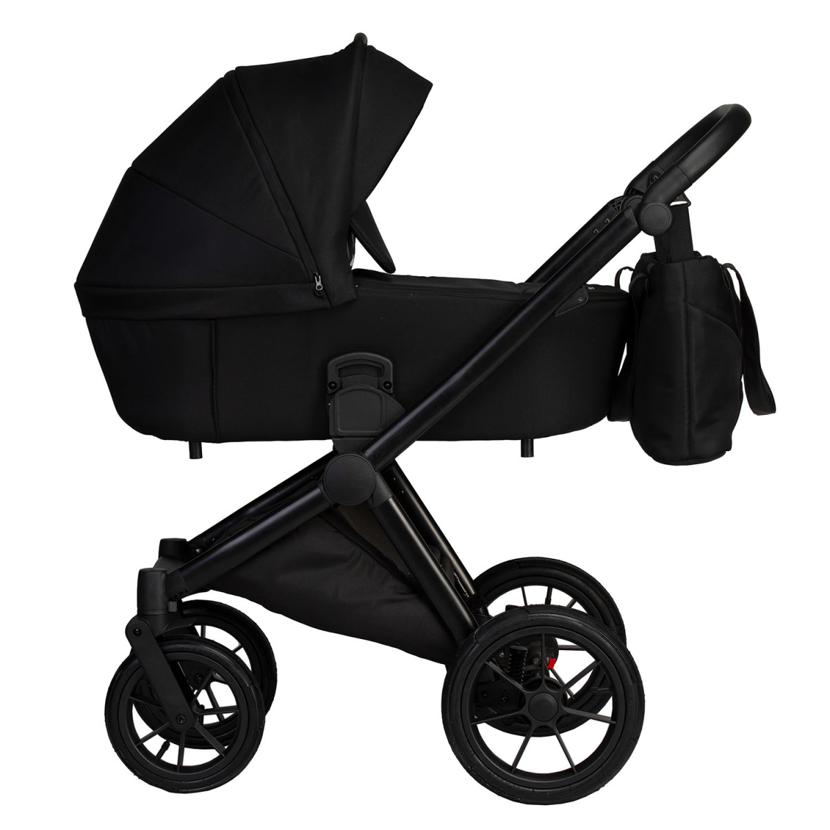 Коляска оснащена легкой и прочной рамой с мягкой амортизацией и большими надувными резиновыми колесами, которые обеспечивают плавный ход на плитке, асфальте, снегу и неровных дорогах.Передние колеса фиксируются для более удобного управления на сложных покрытиях.